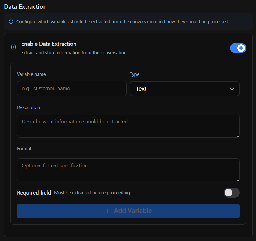 The Data Extraction section captures and stores data from the conversation while the AI is on that node. It ensures that key user inputs are collected, formatted, and stored for later use within the workflow or external integrations.