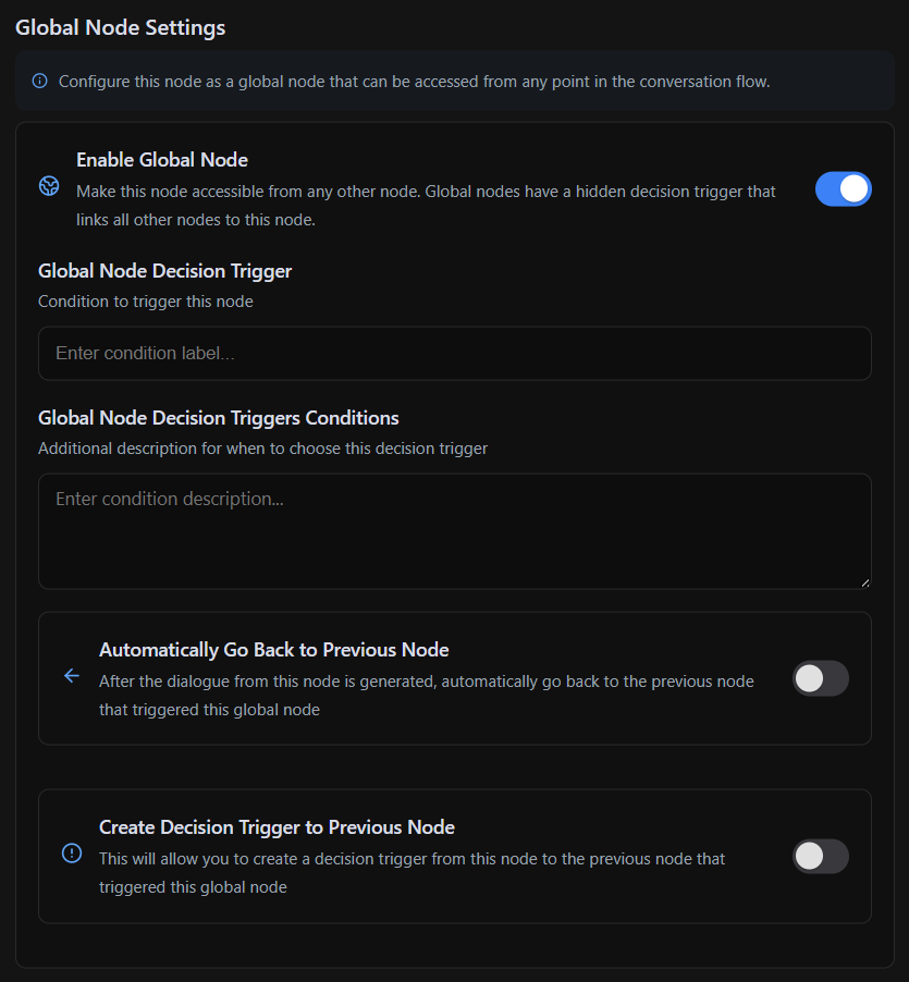 When a node has the Global Node feature enabled, it becomes accessible from any point in the conversation flow. This means that Global Nodes can be triggered at any time, regardless of the current state of the workflow.