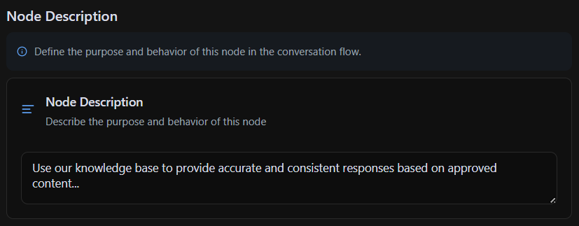 Nodes can be created and configured either manually or using the Node Wizard. The Node Wizard simplifies node creation by automatically generating prompts, conditions, and other necessary configurations based on minimal input. More details on using the Node Wizard can be found in the Building Workflows section. When configuring nodes manually, multiple sections contribute to a node’s functionality. While each node type has unique settings, they share many core components that define their behavior and interaction within the workflow.Common Sections Found in Every Node