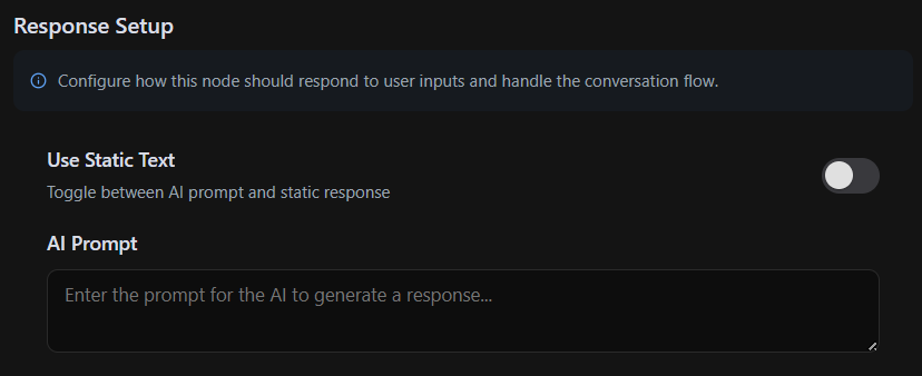 The Response Setup section defines how the AI generates and delivers responses when it reaches the node. It plays a crucial role in ensuring the AI provides accurate, relevant, and engaging interactions at each stage of the workflow.