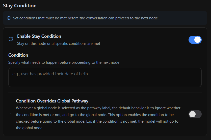 The Stay Condition prevents the AI from moving forward until a specific requirement is met, ensuring critical information is collected or a necessary interaction takes place before progressing to the next step in the workflow. Inside the Stay Condition, you define what must happen before the AI can proceed, and this condition can vary depending on the node’s purpose. For example, a valid Stay Condition could be: “Do not proceed until the user has provided their date of birth.” This means the AI will remain in the current node and continue prompting the user until a valid date of birth is received. If the response is unclear or missing, the AI will ask again instead of advancing in the workflow.