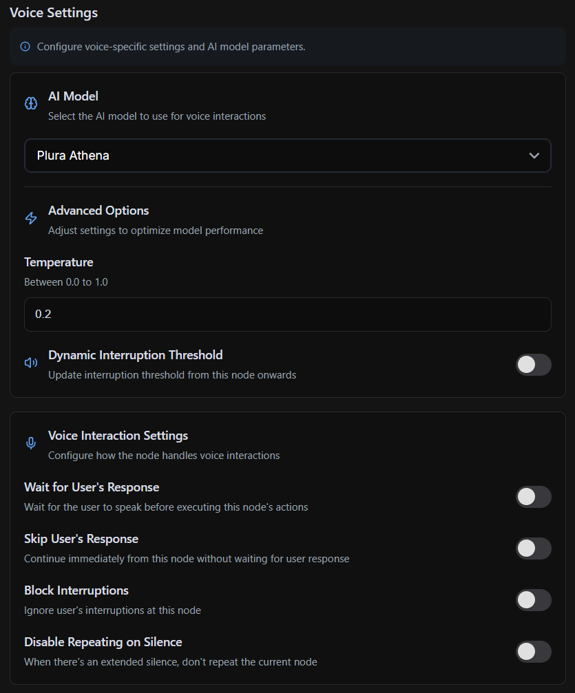 The Voice Settings section provides customization over how the node handles conversational situations and AI voice interactions. It allows fine-tuning of response behavior, interruption management, and AI model preferences.