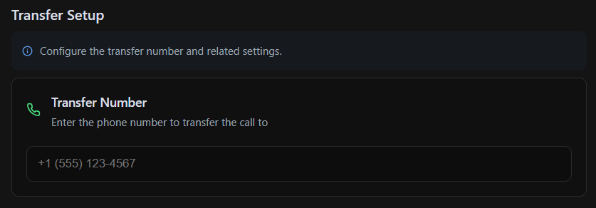 The Transfer Call Node includes a dedicated Transfer Setup section where you can input the phone number the call should be transferred to. Once the transfer is initiated, the AI hands off the call, and the workflow ends.